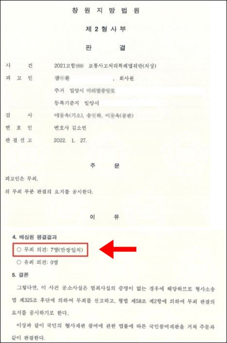 이에 국민 참여재판 배심원 7명은 만장일치로 A씨의 무죄를 평결했으며, 재판부 역시 같은 판결을 내렸습니다.