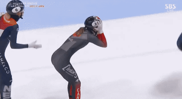 당연히 본인이 1등일거라 생각했던 캐나다의 킴부탱. 킴부탱에게는 밀렸지만 2위를 예상했던 네덜란드의 산드라 벨제부르는 결과를 보고는 크게 놀라며 머리를 감싸 쥐며 절규했는데요. 이 두 선수와 비교해 최민정 선수는 환한 기쁨의 미소를 짓고 있었습니다. 세 나라의 희비가 엇갈린 순간이었는데요.