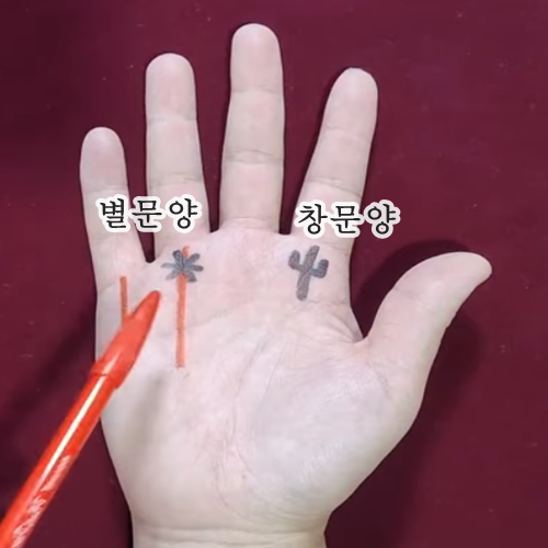 재운선과 태양선이 있다면 다음으로 행운을 상징하는 손금 문양이 있는지를 봅니다. 그 문양은 바로 별 문양과 창 문양입니다. 이 두 문양이 손바닥에 나타나면 행운이 있음을 의미합니다. 하지만 어디에 위치해서 나타나는지까지 확인해야 합니다.