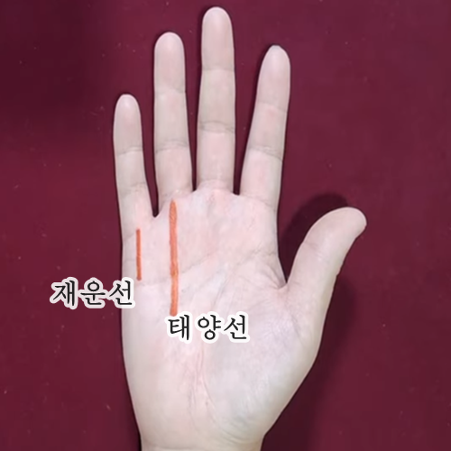 가장 먼저 재운선이 있는지를 봅니다. 새끼손가락 아래에 있는 세로선이 재운선 입니다. 재운선이 있다면 행운의 돈복이 있는 사람으로 재운선 = 돈 이라 생각 하시면 됩니다. 본인의 손에 재운선이 있다면 복권 ,상속, 주식, 분양권 등과 같은 다양한 형태로 금전운이 들어옵니다. 이러한 재운선이 한 줄로 수성의 언덕에 굵고 명확하게 있다면 재물운이 매우 강함을 의미합니다.