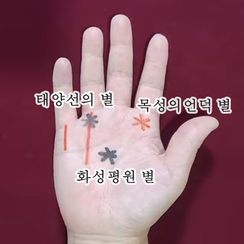 특히 목성의 언덕에 별 문양은 자신의 직업과 관련된 꿈이 이루어지거나 일생일대의 커다란 기회가 오는 것을 의미하는 것으로 큰 행운이 있음을 의미합니다.