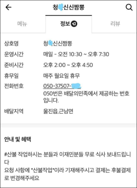 평범한 식당의 정보인것 같지만 하단을 보면 안내 및 혜택에 "산불 작업하시는 분들과 이재민분들 무료 식사 보내드립니다. 요청 사항에 '산불 작업'이라 기재해 주시고 결제는 후불 결제로 변경해주세요."라는 내용이었습니다.
