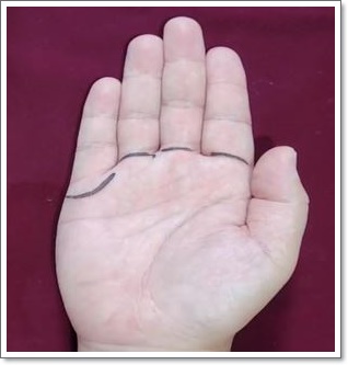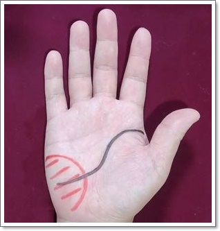 다음으로 생명선이 비정상적으로 월구(달의언덕)으로 내려가 있는지를 봅니다. 이러한 생명선을 가진 사람은 자식이 없