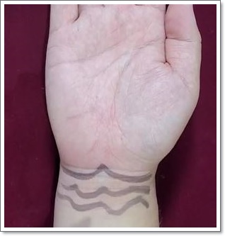 하지만 손목선이 물결모양이나 아치형이라면 자식이 없음을 의미하는 손금입니다. 이런 물결모양의 손목선이 있다면 남자든 여자든 정력이 약한 체질이라 할 수 있습니다. 그래서 자식을 갖기가 어려운 것입니다.