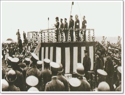 일왕의 생일을 축하하는 천장절 공식 행사와 열병식이 2시간 30분 동안 진행이 되었고, 오전 11시 40분 모든 참석자들이 선 채 해군 군악대 주악에 맞춰 일본 국가 기미가요를 부르기 시작했습니다.