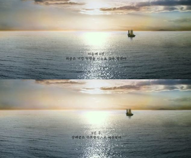 배가 출발하고 저 멀리 도승지 허균이 미소 지으며 인사를 하면서 가짜 왕을 떠나보냅니다.