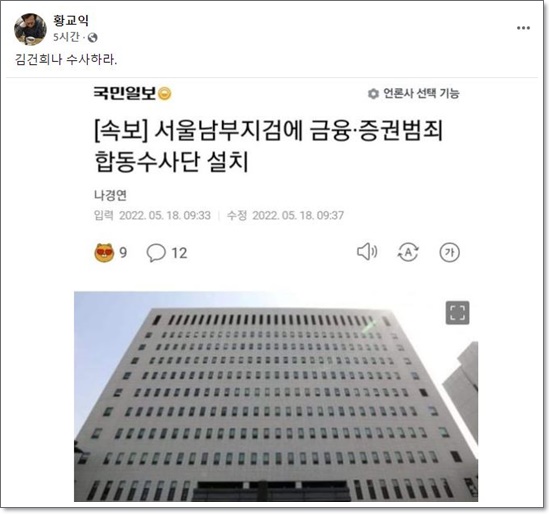 황 씨의 페이스북에는 오늘 김건희 여사 관련해 또 다른 글이 올라와 있습니다.