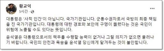 황교익 씨는 "대통령은 '사적 인간'이 아닙니다. 국가기관입니다. 군통수권자로서 국방의 최종 책임을 진 국가기관입니다.