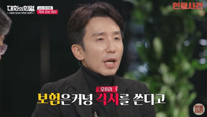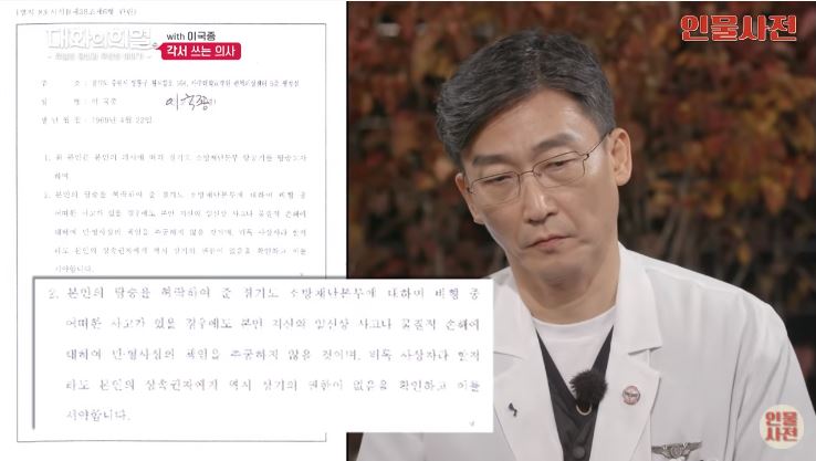 대화중 이국종 교수님께 "헬기를 타고 부상을 입으시면 어떡하냐, 보험 처리가 되냐" 질문을 했을 때 "전혀 안 된다고 오히려 각서 쓴다"라고 대답하십니다.