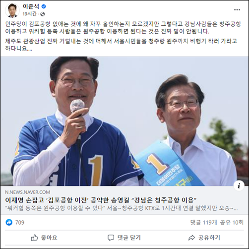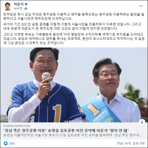 국가의 기간 SOC인 공항 문제를 이렇게 가볍게 서울시민을 조롱하듯이 다루면 안 됩니다.그리고 내국 관광객 의존도가 큰 제주도에 대한 고민도 없이 이렇게 던지면 곤란합니다.