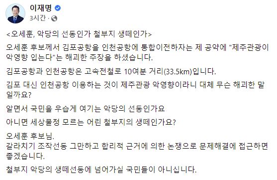 이재명 후보는 자신의 페이스북에 자신의 '김포공항 이전' 공약을 비판한 오세훈 서울시장 후보를 향해 이렇게 말했습니다.