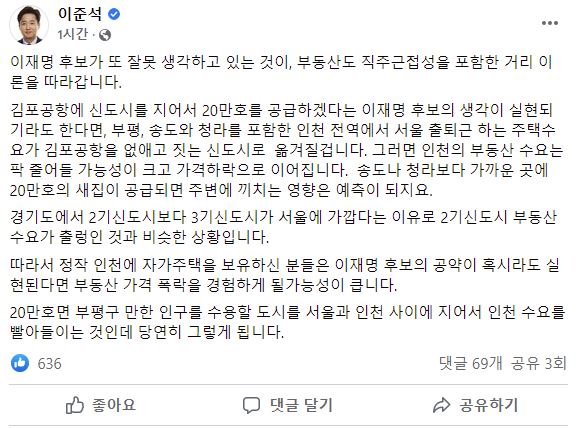 김포공항에 신도시를 지어서 20만호를 공급하겠다는 이재명 후보의 생각이 실현되기라도 한다면, 부평, 송도와 청라를 포함한 인천 전역에서 서울 출퇴근 하는 주택수요가 김포공항을 없애고 짓는 신도시로 옮겨질겁니다. 그러면 인천의 부동산 수요는 팍 줄어들 가능성이 크고 가격하락으로 이어집니다. 송도나 청라보다 가까운 곳에 20만호의 새집이 공급되면 주변에 끼치는 영향은 예측이 되지요.