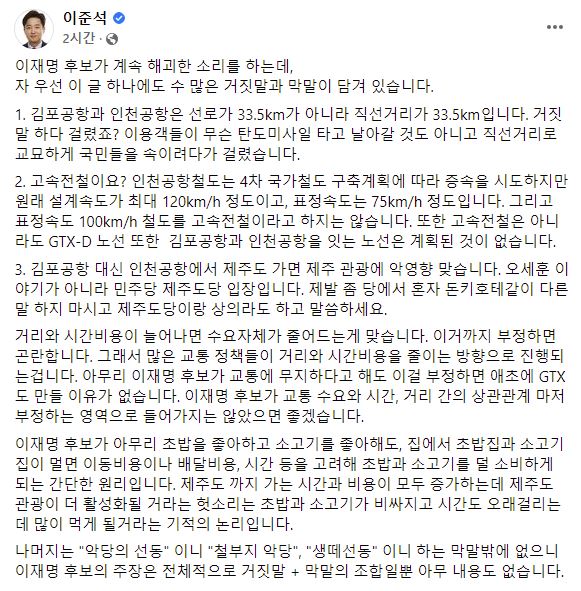 이재명 후보의 주장에 대해 이준석 대표 뿐 아니라 박형준 부산시장 후보역시 본인의 페이스북에 이재명 후보의 주장을 반박했습니다. 김포공항이 없어지면 제주 뿐 아니라 부산도 피해를 입는다는 내용의 글을 올렸는데요.