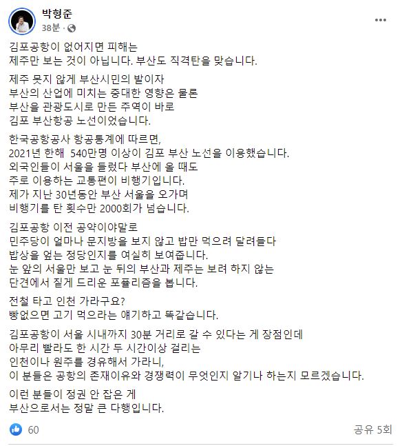 이재명 후보의 주장에 대해 이준석 대표 뿐 아니라 박형준 부산시장 후보역시 본인의 페이스북에 이재명 후보의 주장을 반박했습니다. 김포공항이 없어지면 제주 뿐 아니라 부산도 피해를 입는다는 내용의 글을 올렸는데요.