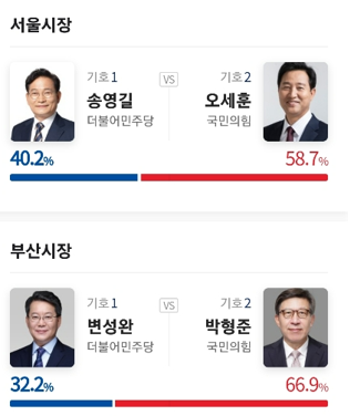 서울 시장과 부산 시장에는 국민의힘 오세훈 후보와 박형준 후보가 우세한 것으로 나타났습니다.