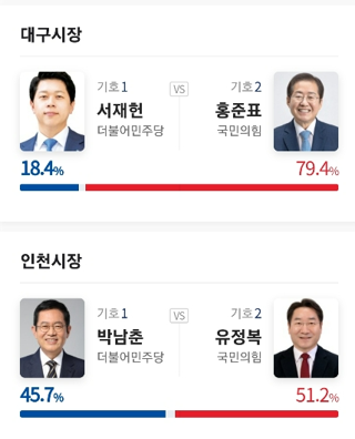 대구시장은 홍준표 국민의힘 후보가 앞서나가는 것으로 출구조사 결과가 나왔으며, 접전이 예상되는 인천시장은 유정복 국민의힘 후보가 51.2%로 근소하게 앞서는 것으로 나타났습니다.