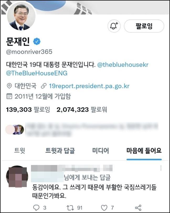 6월 1일 문재인 전 대통령의 공식 트위터 계정이 이재명 더불어민주당 인천 계양을 당선인을 겨냥한 “그 쓰레기 때문에 부활한 국짐 쓰레기들”이라는 내용의 트위터 글에 ‘좋아요’를 누른 것으로 나타나 논란이 있었습니다.