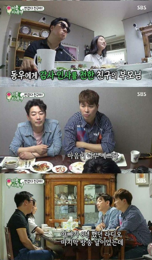 SBS ‘미운 우리 새끼’에서 이동우와 그의 딸 지우를 김경식과 박수홍이 찾아갔습니다. 방송인 이동우가 지난 8년 간 DJ로 활동해온 라디오 방송을 그만두게 되어 격려하고자 이동우 집에서 함께 식사를 한 것입니다.