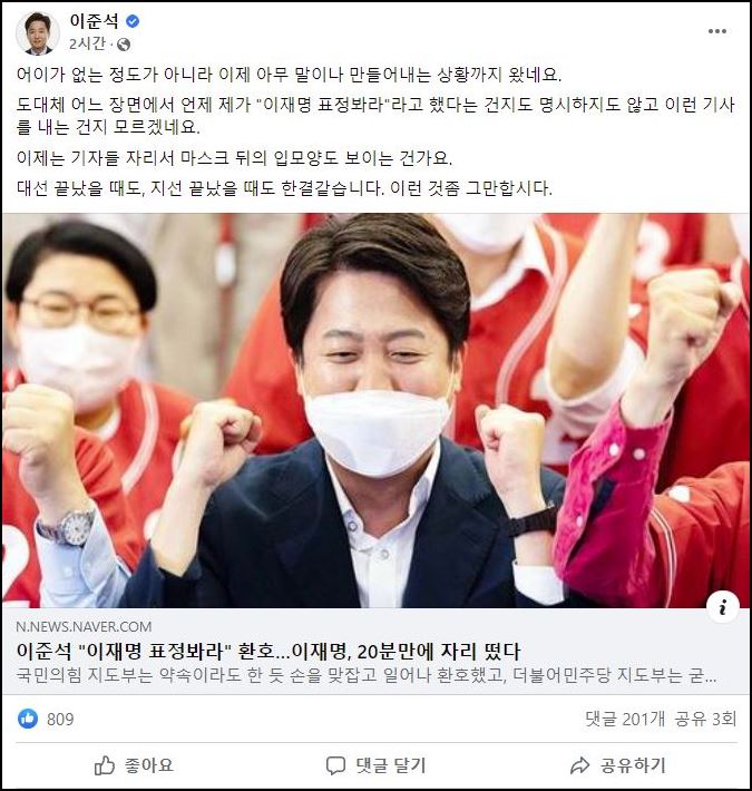 이준석 대표는 "도대체 어느 장면에서 언제 제가 "이재명 표정 봐라"라고 했다는 건지도 명시하지도 않고 이런 기사를 내는 건지" 라며 "기자들 자리서 마스크 뒤의 입모양도 보이는 건가요" 라며 불쾌감을 나타냈습니다. "대선 끝났을 때도, 지선 끝났을 때도 한결같습니다. 이런 것좀 그만합시다."라고 덧붙였습니다.