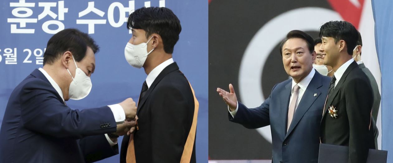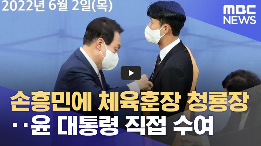 아시아인 최초로 잉글랜드 프리미어리그(EPL) 득점왕에 오른 손흥민. 6월 2일 윤석열 대통령이 체육 훈장 중 최고 등급인 '청룡장'을 손흥민 선수에게 수여했습니다.