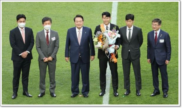 잠시후 손을 흔들며 경기장에 입장한 윤석열 대통령은 손흥민 선수 가슴에 직접 청룡장을 달아준 후 악수를 했습니다.