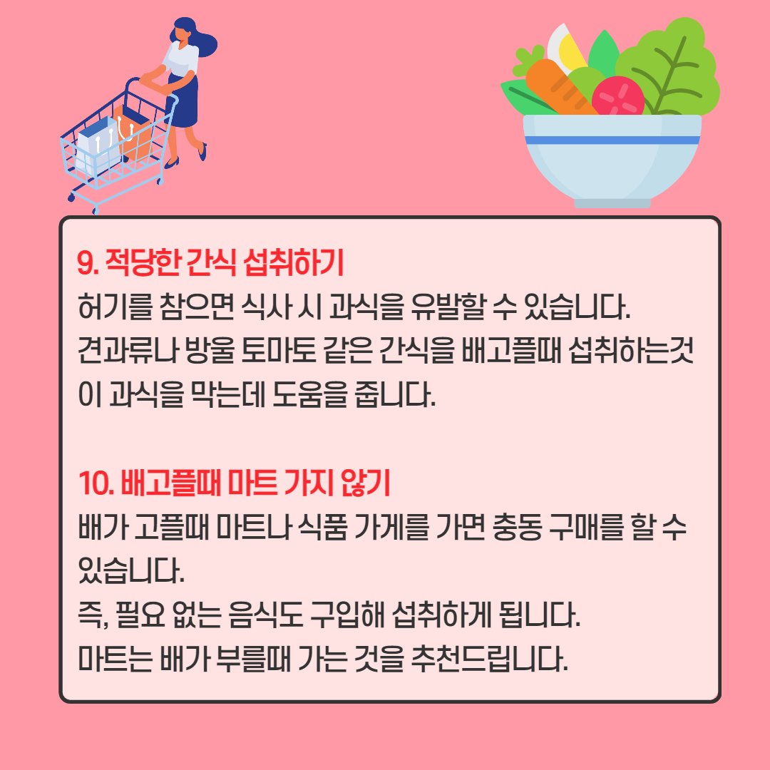 배가 고플때 마트나 식품 가게를 가면 충동구매를 할 수 있습니다. 즉, 필요 없는 음식도 구입해 섭취하게 됩니다. 마트는 배가 부를 때 가는 것을 추천드립니다.