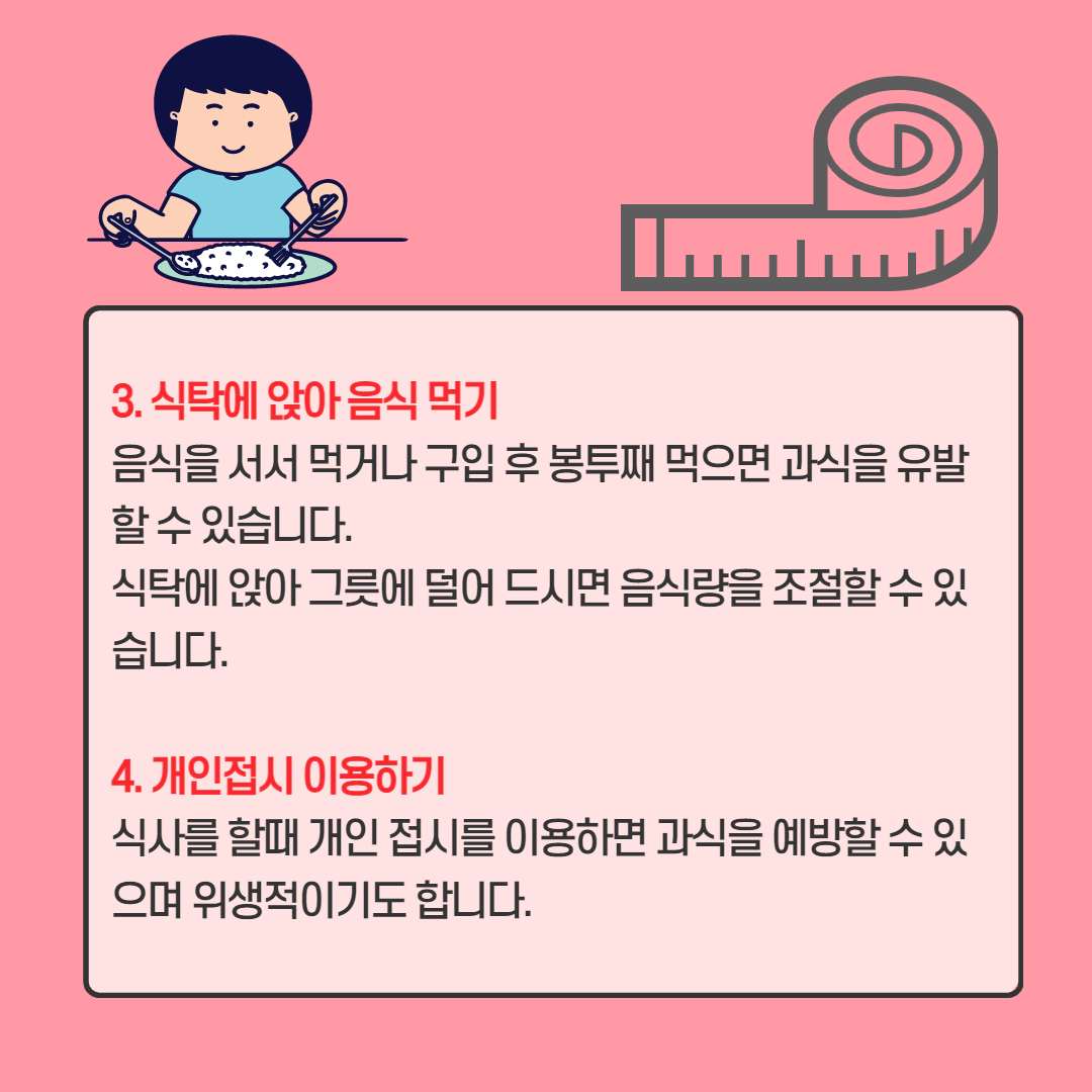음식을 서서 먹거나 구입 후 봉투째 먹으면 과식을 유발할 수 있습니다. 식탁에 앉아 그릇에 덜어 드시면 음식량을 조절할 수 있습니다.