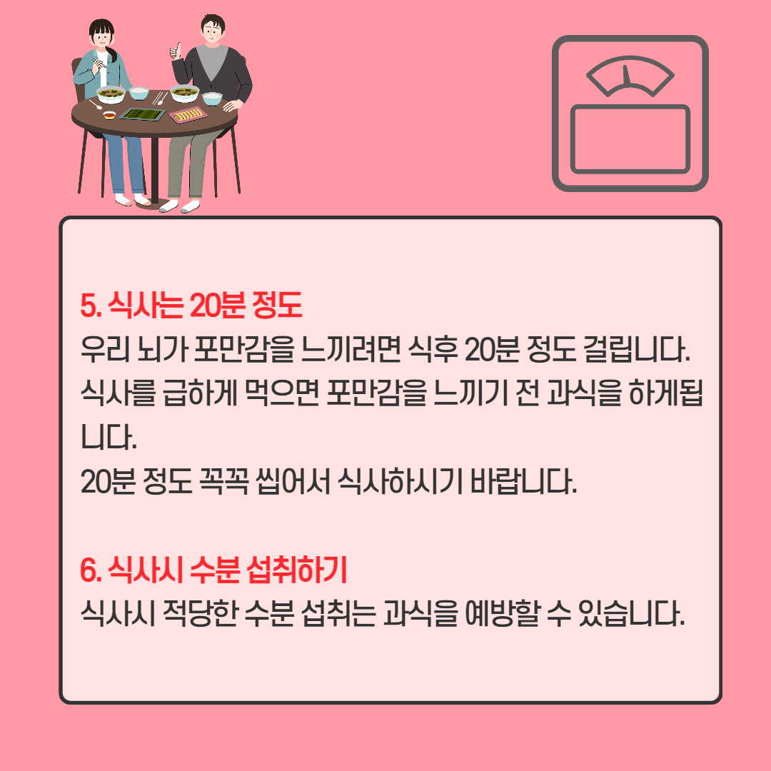 우리 뇌가 포만감을 느끼려면 식후 20분 정도 걸립니다. 식사를 급하게 먹으면 포만감을 느끼기 전 과식을 하게 됩니다. 20분 정도 꼭꼭 씹어서 식사하시기 바랍니다.