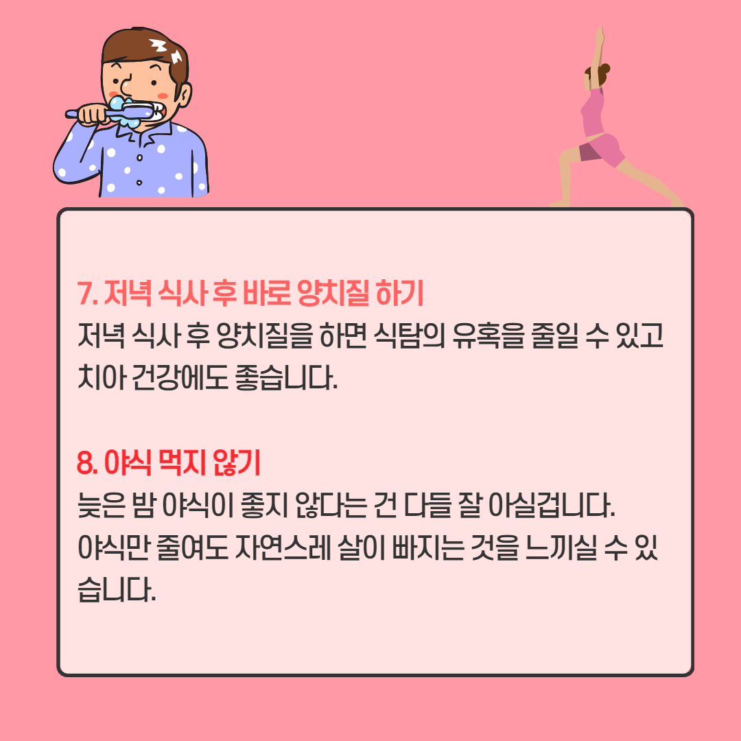 저녁 식사 후 양치질을 하면 식탐의 유혹을 줄일 수 있고 치아 건강에도 좋습니다.