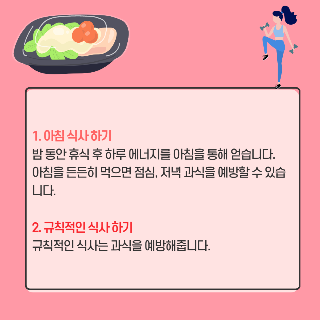 밤 동안 휴식 후 하루 에너지를 아침을 통해 얻습니다. 아침을 든든히 먹으면 점심, 저녁 과식을 예방할 수 있습니다.