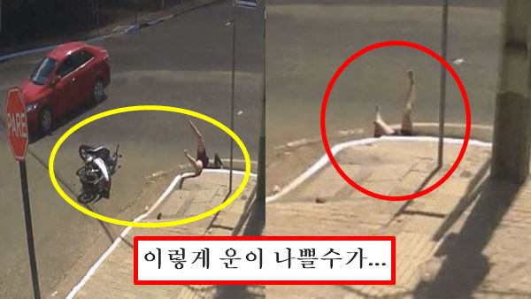 충격으로 오토바이에서 튕겨져 나간 여성은 몇바퀴 구른 후 하수구로 머리부터 빠지며 사라집니다.