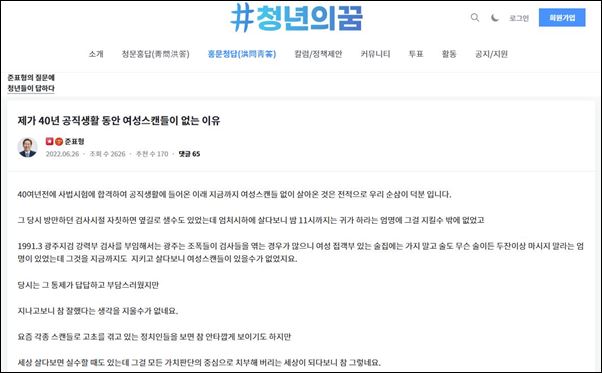 홍준표 대구 시장 당선인이 자신의 온라인 정치 플랫폼인 '청년의꿈' 홍문청답(洪問靑答) 게시판에 '제가 40년 공직생활 동안 여성스캔들이 없는 이유'라는 글로 이준석 대표에 대해 언급을 했습니다.