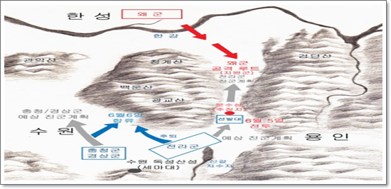 권율 장군은 “도성이 멀지 않고, 대적이 눈앞에 있는데, 그대로 임진강까지 진군하여, 적과 일전을 벌여야 할 것이오” 라며 한양을 탈환해야 한다고 주장했습니다. 하지만 군사에 무지한 문신 출신 이광은 권율 장군의 의견을 무시하고 용인으로 진격합니다.