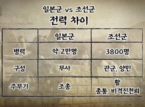 진주대첩 당시 전력을 살펴보면 일본군은 2만의 대군이었으며 조선군은 민관을 합쳐 3800명이었습니다. 6:1 의 불리한 전투였습니다.