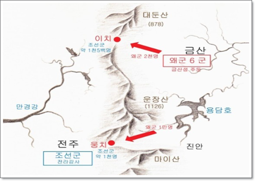왜군 제6진의 주장 고바야카와 다카카게가 1만여 명의 병력을 이끌고 전라도로 진출하려 했습니다. 왜군은 웅치와 이치쪽을 통해 전주로 나아가려했습니다. 고바야카와의 부장 안코쿠지 에케이가 1만 군사를 이끌고 웅치로 진격합니다.