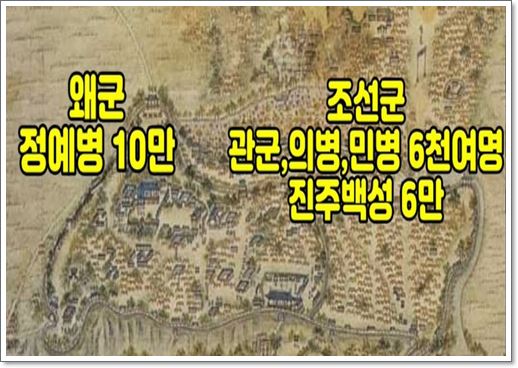 제2차 진주성 전투의 전력을 살펴보면 왜군은 10만 정예병이었으며 조선은 관군과 의병 및 민병을 합쳐 6천여명이었습니다. 거기에 더해 약 6만여명의 진주 백성이 있었습니다.