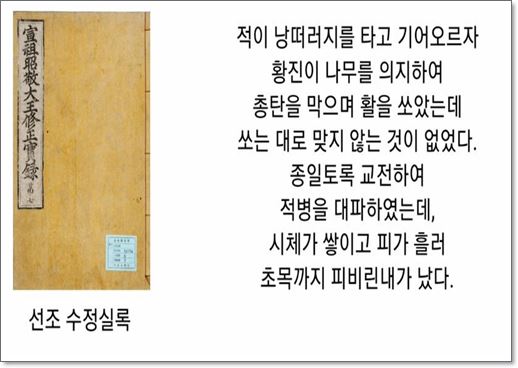 실록에서도 권율과 함께 이치 전투에서 황진의 공을 으뜸으로 꼽았습니다.