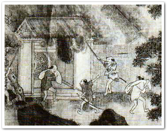 왜구는 약탈한 곡식들을 함선에 적재할 때 흔들리지 않도록 큰 밧줄로 배들을 서로 잡아매고, 일부 병력을 남겨둔 채 육지를 돌아다니며 곡식을 비롯한 재물을 약탈하기 시작하였습니다. 왜구들로 인해 고려 백성들의 시체가 산과 들에 나뒹굴었으며, 왜구가 노략질한 곡식을 질질 끌며 운반하다 보니 땅에 널브러진 곡식들도 수북했다고 합니다.