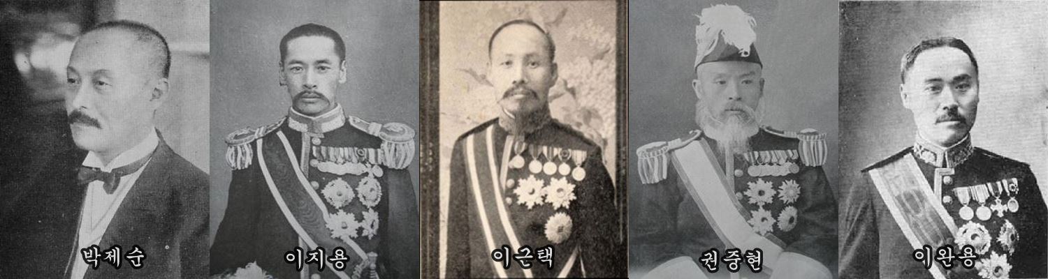 시종원경 윤덕영, 궁내부대신 민병석, 탁지부대신 고영희, 내부대신 박제순, 농상공부대신 조중응, 친위부장관 겸 시종무관장 이병무, 이완용의 처남인 승녕부총관 조민희, 내각총리대신 이완용이 그들입니다.