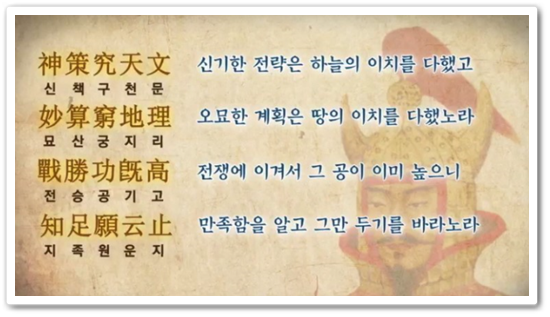 "신기한 전략은 하늘의 이치를 다했고 오묘한 계획은 땅의 이치를 다했노라. 전쟁에 이겨서 그 공이 이미 높으니 만족함을 알고 그만두기를 바라노라"