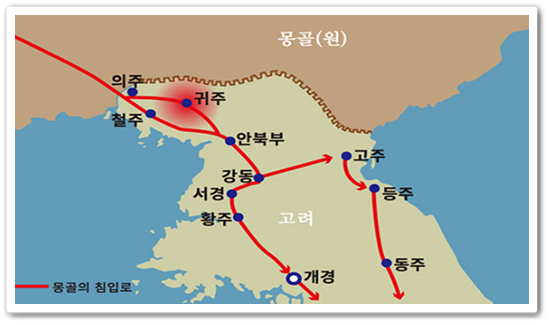 예상치 못한 상황을 마주한 몽골군은 부대를 나눠 개경으로 진격했습니다. 이에 무능한 고려 정부는 강화를 맺었는데, 그 조건에 귀주성 항복이 있었습니다.