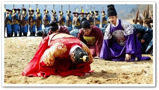 인조는 단상 위에 앉은 후금의 황제 홍타이지에게 아홉 번 머리를 조아려 황제에게 최대한의 경의를 표시하는 인사법인 삼배구고두례를 행하며 항복했는데 이 사건이 바로 한민족 역사상 가장 치욕스러운 사건 중 하나로 여겨지는 삼전도의 굴욕입니다.